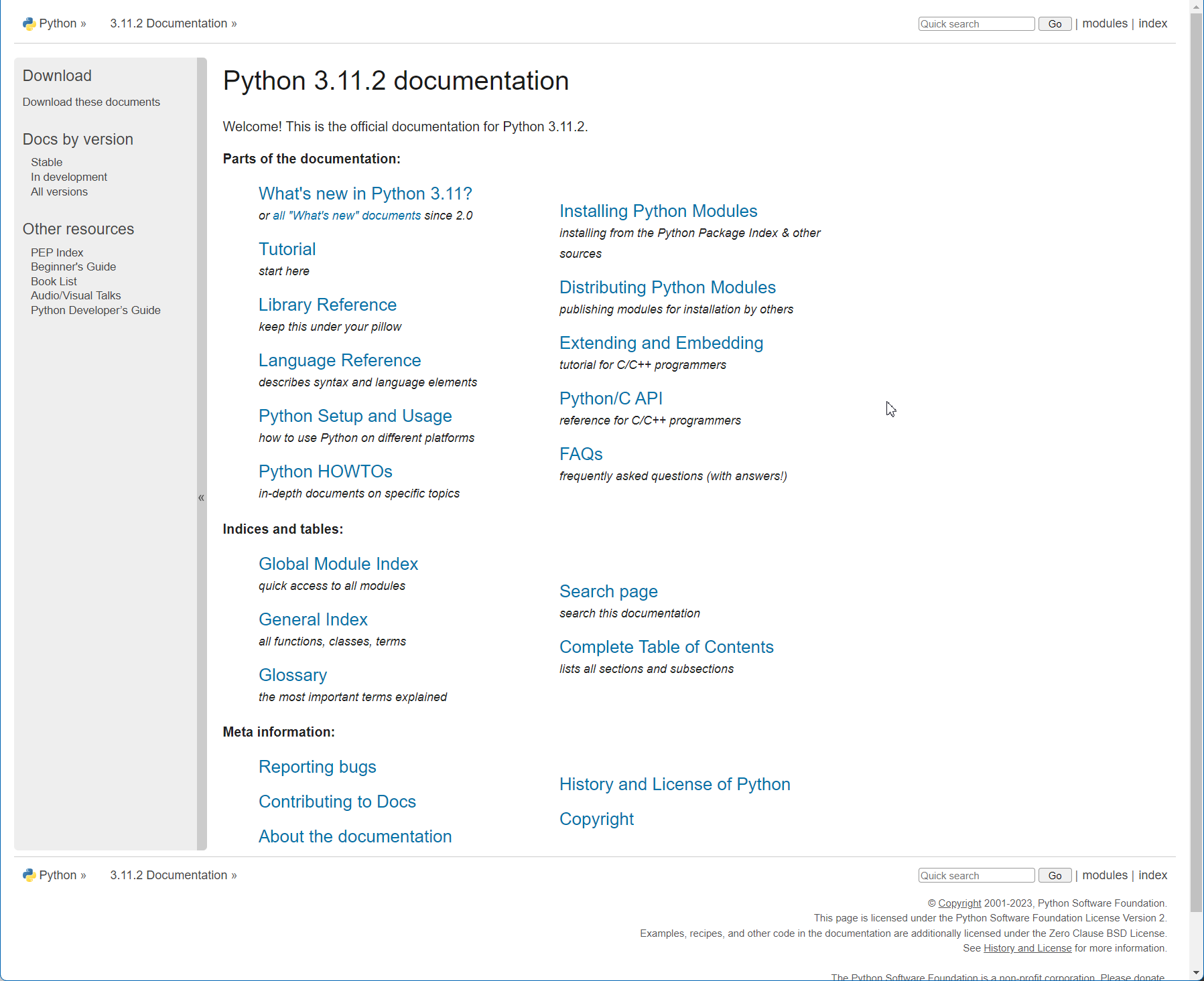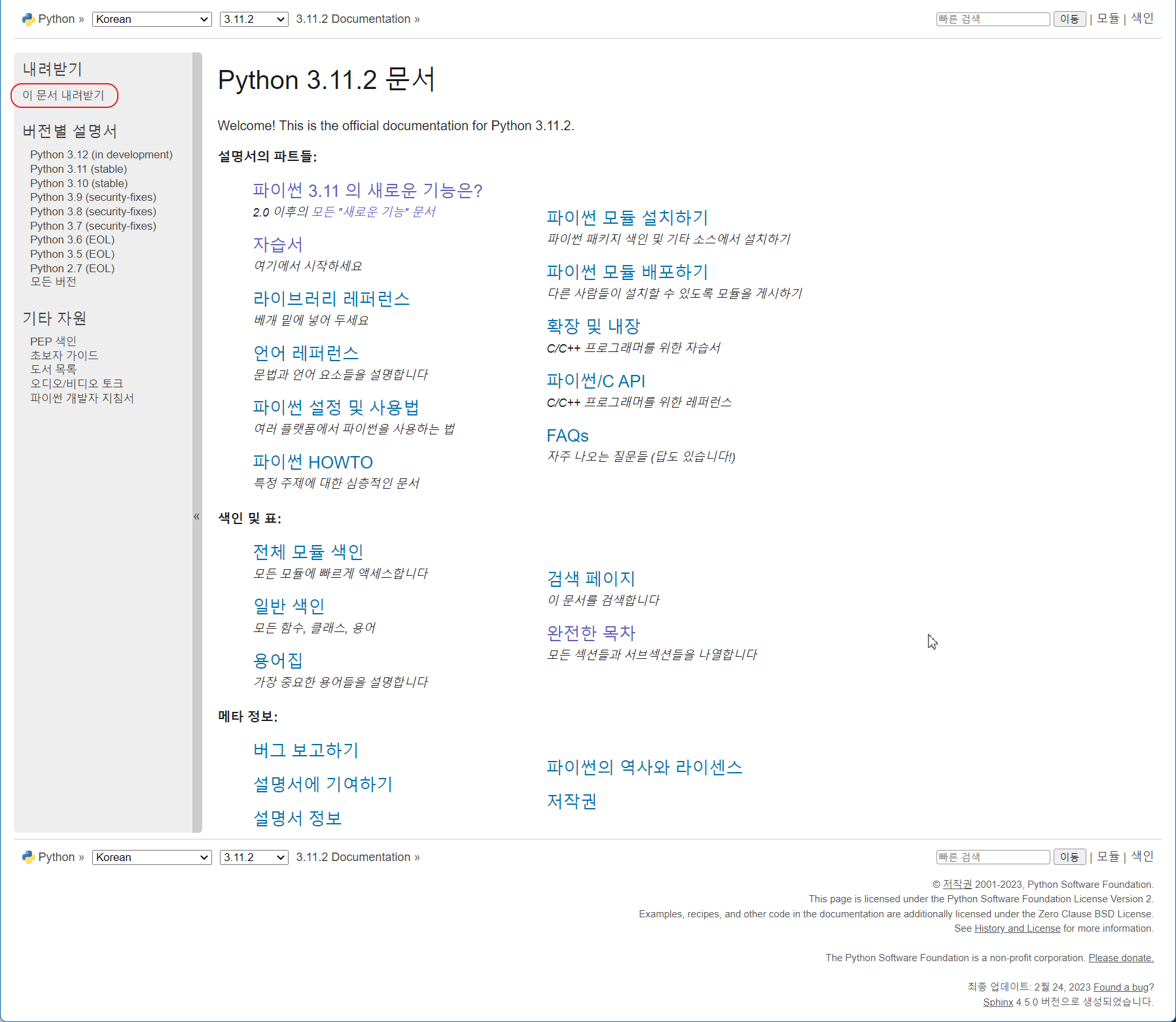 나는 Python 3.11 Manuals (64-bit)를 클릭하여 크롬에 보여주는 python 3.11.2 문서를 이용할 것이다. 영문으로 되어 있기 때문에 python 사이트의 한글로 번역된 버전을 사용한다. (Python 3.11.2 문서 한글)