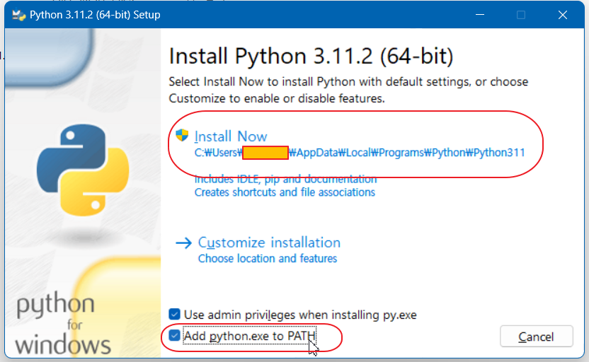 - 설치창에서 제일 하단에 있는 "Add python.exe to PATH" 를 체크하고, 상단의 "Install Now"를 클릭한다. python.exe 파일이 설치되는 위치는 "Install Now" 문구가 적힌 바로 아래의 경로에 설치된다. Python은 버전마다 다른 경로를 사용하기 때문에 하나의 시스템에 여러개의 Python 버전을 설치해서 사용할 수도 있다. 컴퓨터 사양에 따라서 조금 다르겠지만, 설치는 금방 완료된다.