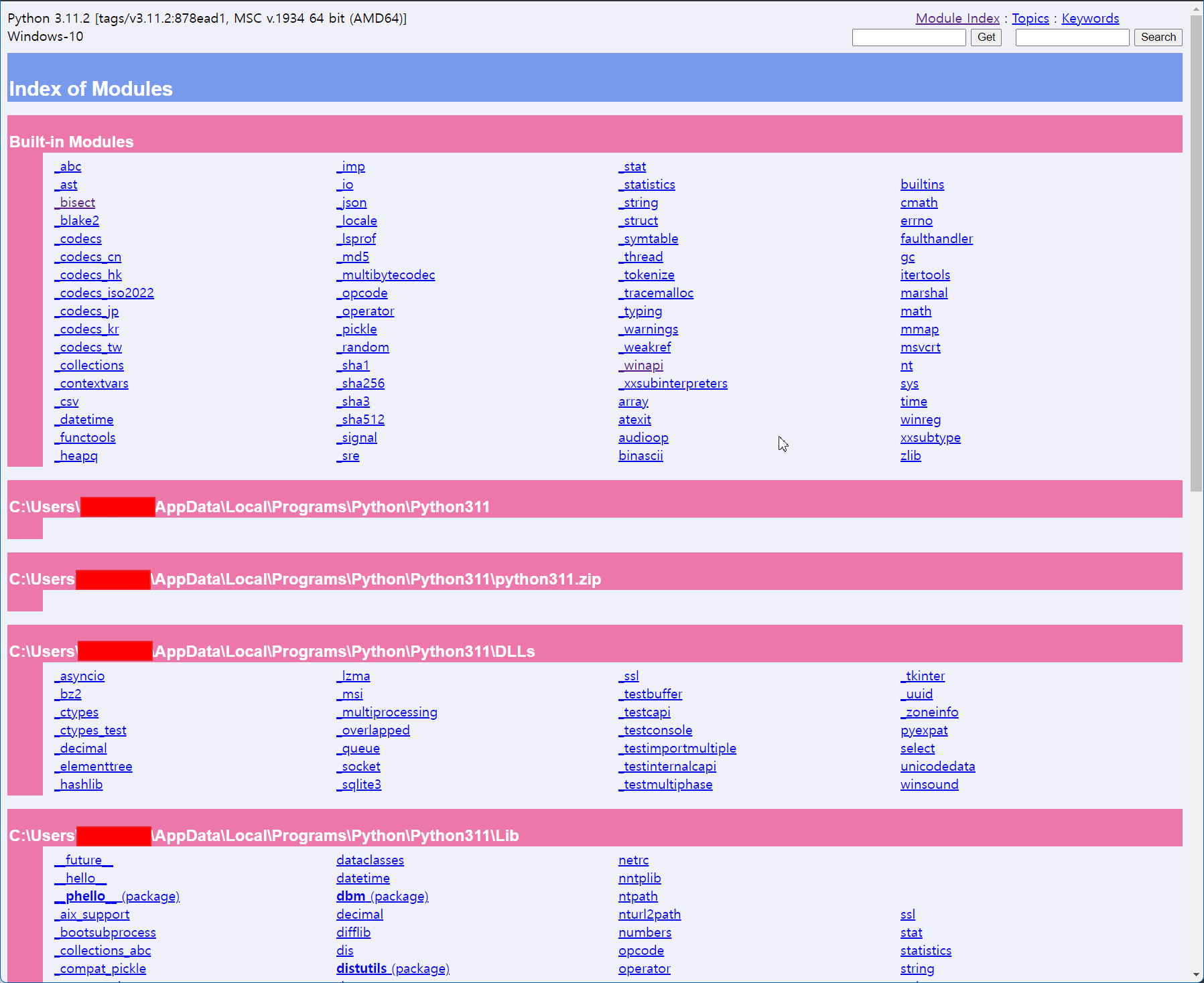 세번째의 Python 3.11 Module Docs (64-bit)는 브라우즈(Chrome, Edge 등)에 python module 도움말 화면을 보여주며 콘솔 화면(module 도움말 서버)이 같이 실행되며, 콘솔 화면을 닫으면 브라우자상의 도움말이 동작하지 않는다.