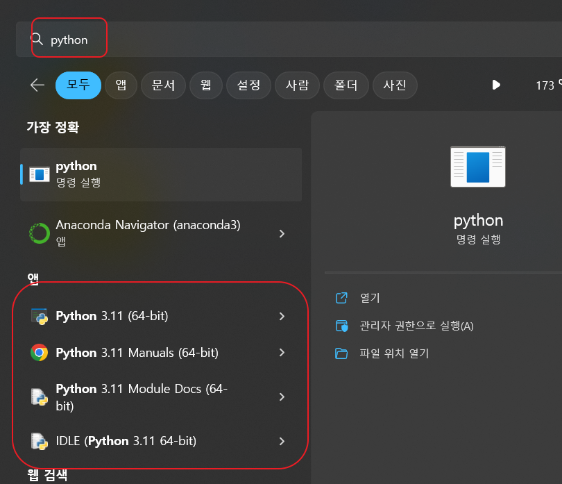 목록의 첫번째에 보이는 Python 3.11 (64-bit) 는 PowerShell(까만화면, 도스화면, 콘솔화면)에서 python을 실행하며, 두번째의 Python 3.11 Manuals (64-bit)는 브라우즈(Chrome, Edge 등)에 python3.11에 관련된 문서를 보여주고,