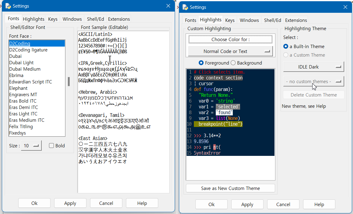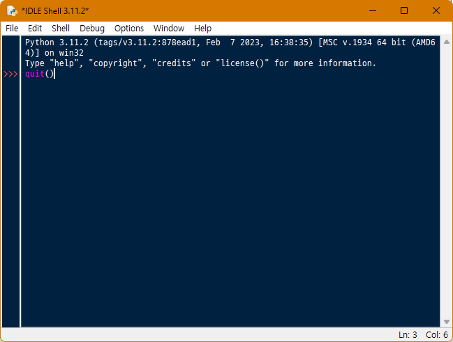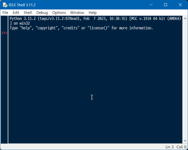 IDLE (Python 3.11 64-bit)를 실행하면 다음과 같은 모양의 창이 나타난다. 커서가 위치한 오른쪽 창과 >>> 표시가 있는 왼쪽 부분으로 나눠진다. 메뉴가 많이 있지만, 나는 하얀 바탕화면을 싫어하므로, 테마를 어두운 색으로 바꾸고, 폰트는 D2Coding으로 바꿨다. Options 메뉴 -> Configure IDLE 에서 변경 가능하다.