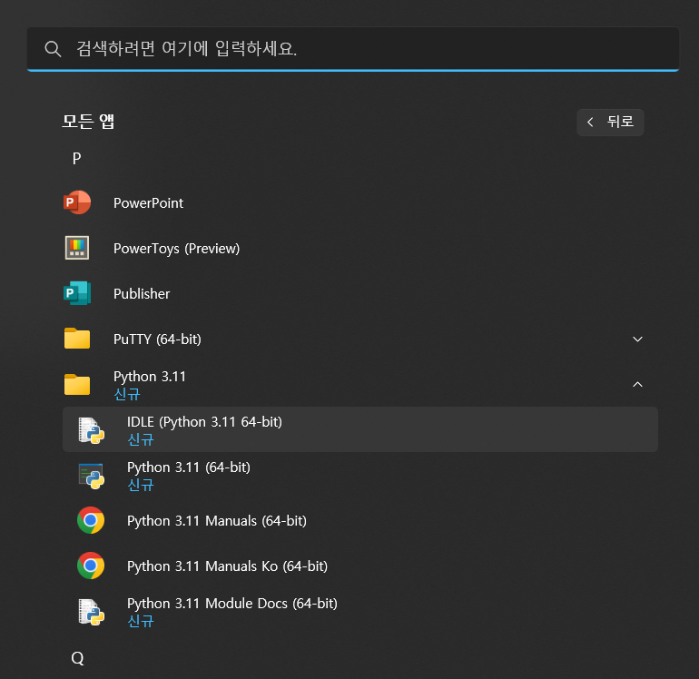 작업표시 줄의 윈도우즈 아이콘 클릭 -> 모든 앱 클릭 -> Python 3.11 클릭 -> IDLE (Python 3.11 64-bit)를 클릭하면 실행한다. 윈도우즈 아이콘을 클릭하여 검색해서 실행할 수 있다.