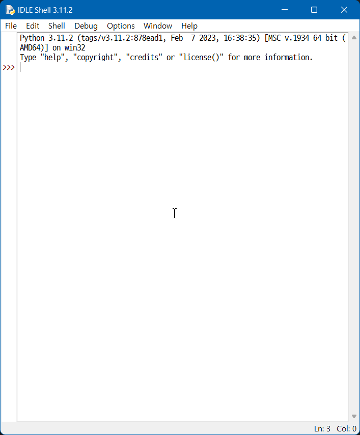 IDLE (Python 3.11 64-bit)를 실행하면 다음과 같은 모양의 창이 나타난다. 커서가 위치한 오른쪽 창과 >>> 표시가 있는 왼쪽 부분으로 나눠진다. 메뉴가 많이 있지만, 나는 하얀 바탕화면을 싫어하므로, 테마를 어두운 색으로 바꾸고, 폰트는 D2Coding으로 바꿨다. Options 메뉴 -> Configure IDLE 에서 변경 가능하다.